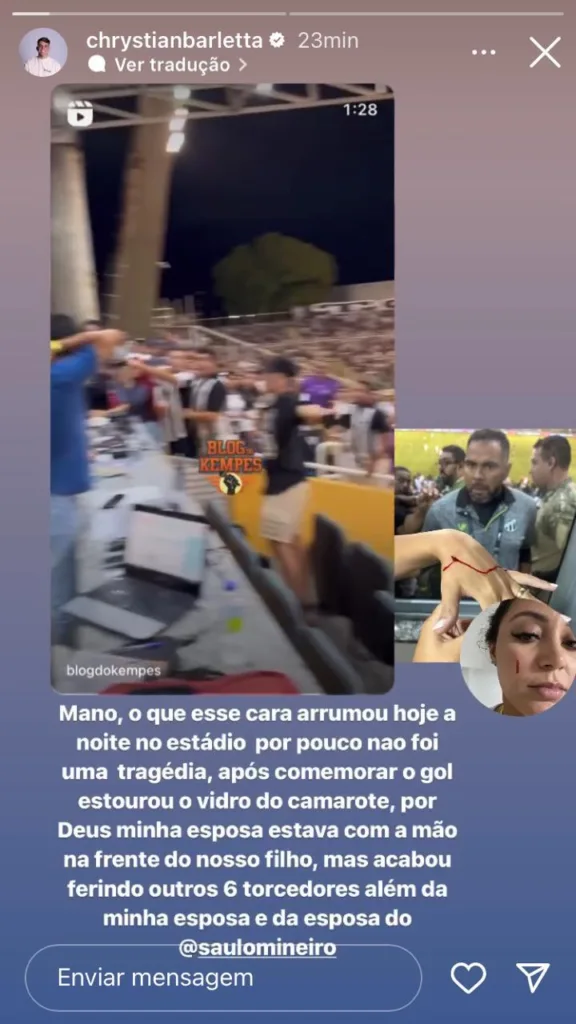 Ainda segundo a apuração, os estilhaços atingiram alguns torcedores do Vovô que estavam nas cadeiras sociais, incluindo as esposas dos atacantes Chrystian Barletta e Saulo Mineiro. Além de Nenê, outros atletas e membros da delegação do time gaúcho foram escoltados pela Polícia Militar para evitar uma confusão maior. Durante o jogo, a torcida alvinegra entoou cânticos como “Nenê vai se f…” e, após a quebra do vidro, jogou cerveja em direção ao local onde estavam os representantes do time gaúcho.