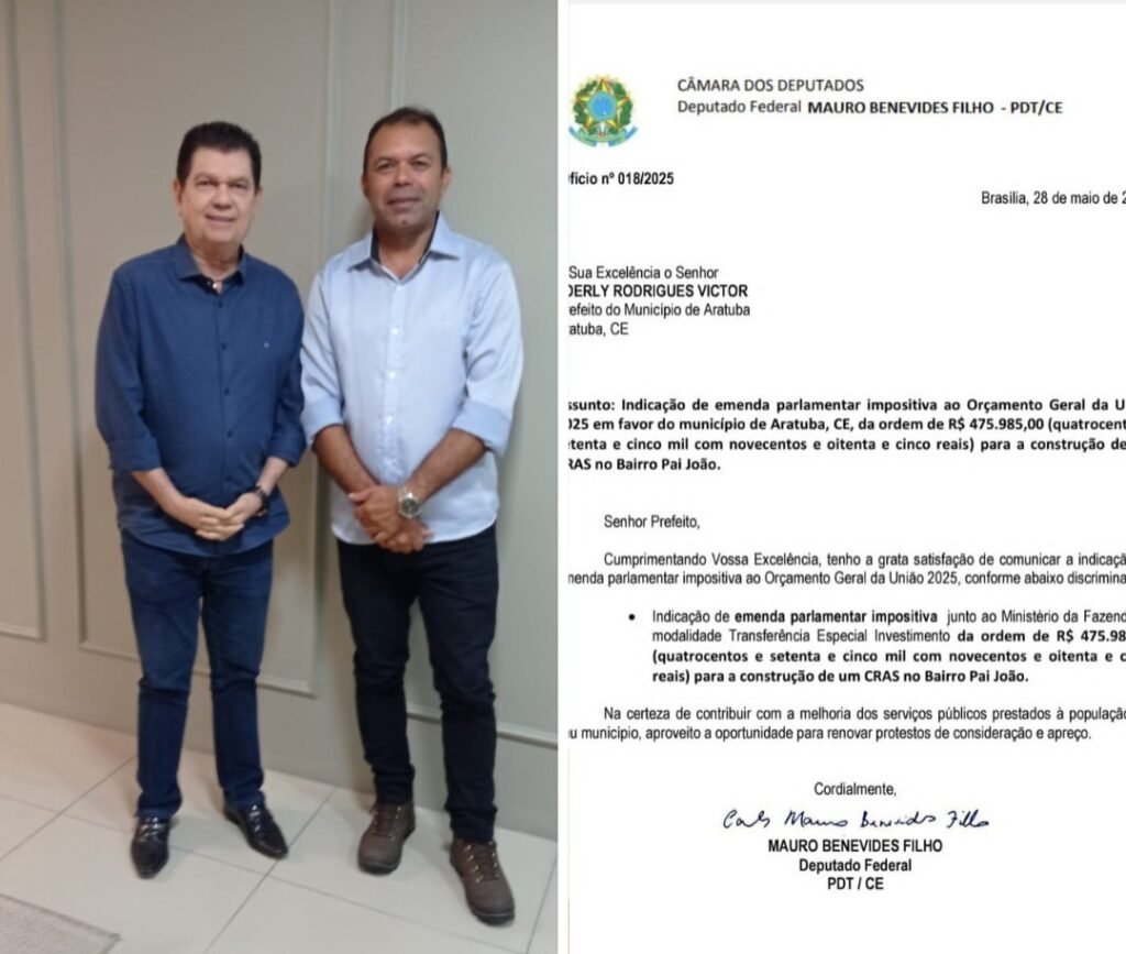 A Prefeitura de Aratuba já conta em caixa com o valor de R$ 471.225,15, destinado à construção do Centro de Referência da Assistência Social (CRAS) no distrito de Pai João. O recurso é fruto de uma emenda parlamentar impositiva ao Orçamento Geral da União de 2025, indicada pelo deputado federal Mauro Benevides Filho.
