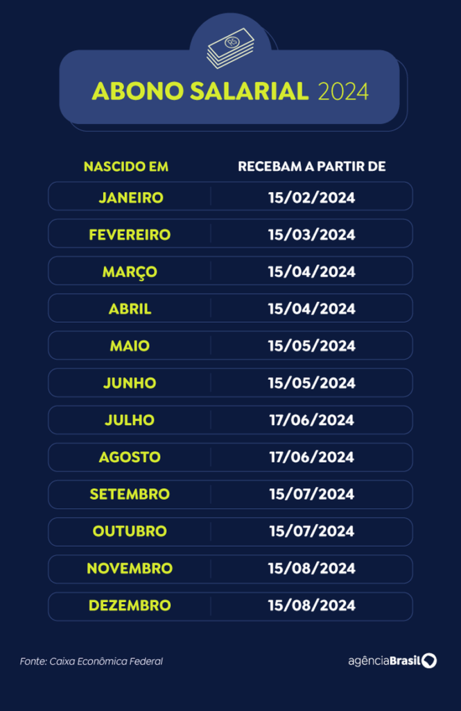 Cerca de 4,26 milhões de trabalhadores com carteira assinada nascidos em julho e agosto podem sacar, a partir desta segunda-feira (17), o valor do abono salarial do Programa de Integração Social (PIS) e do Programa de Formação do Patrimônio do Servidor Público (Pasep) em 2024. A quantia está disponível no aplicativo da Carteira de Trabalho Digital e no Portal Gov.br.