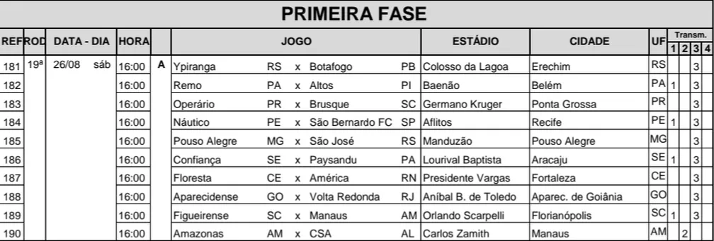 Todas as partidas serão disputadas no dia 26 de agosto, às 16h. É uma medida que impede que as equipes saibam o resultado dos outros jogos da rodada e tentem se beneficiar de alguma forma.