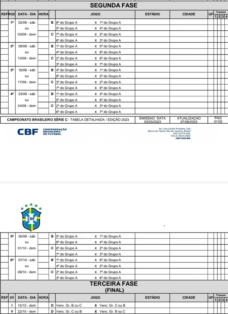 A Confederação Brasileira de Futebol (CBF) definiu a data e horário da 19ª rodada da Série C 2023 – a última da primeira fase.