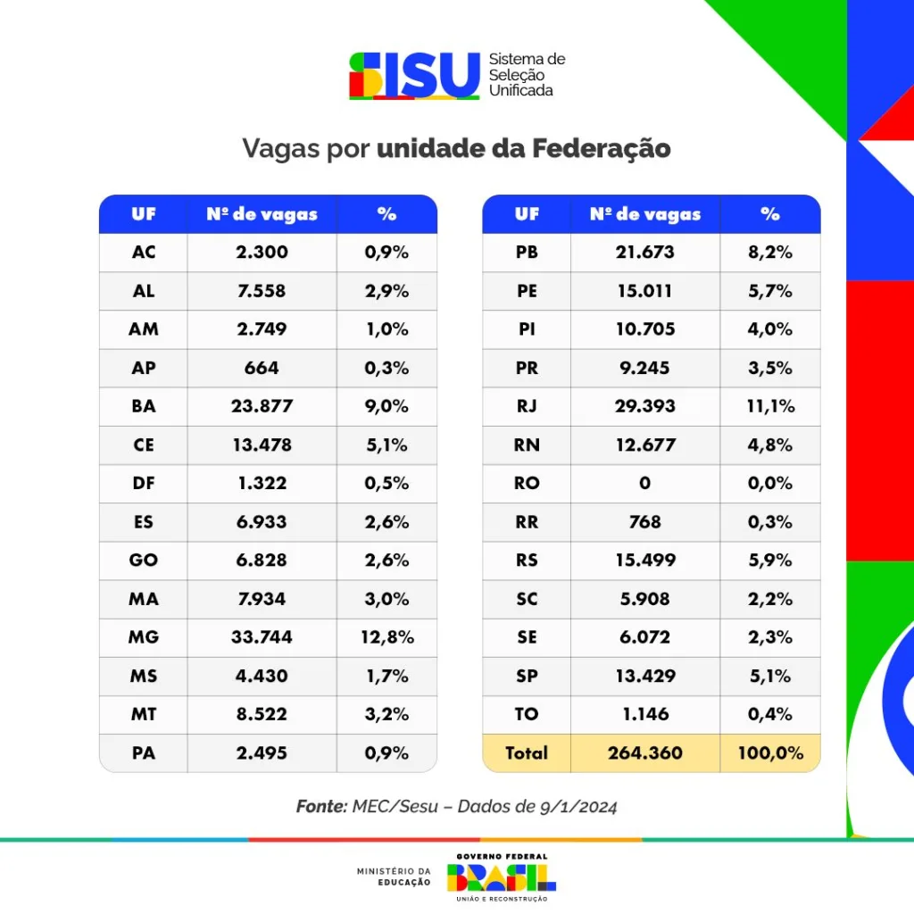 Quando se observa a distribuição de vagas por unidades da Federação, Minas Gerais e Rio de Janeiro são os estados com a maior oferta de vagas em 2024: 12,8% e 11,1%, respectivamente. As universidades participantes da Bahia somam 9% das vagas, seguidas pela Paraíba (8,2%) e pelo Rio Grande do Sul (5,9%). Em seguida vem o estado de Pernambuco com 15.011 vagas e depois o Ceará, em sétimo lugar, com 13.478 vagas.