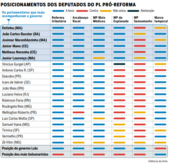 Um levantamento feito pelo jornal O Globo mostra que, dos 20 deputados do PL que se posicionaram a favor da Reforma Tributária no primeiro turno da votação, 18 já tinham ajudado a levar adiante a proposta do arcabouço fiscal, em maio, e 17 também deram aval à MP do Mais Médicos, em junho.