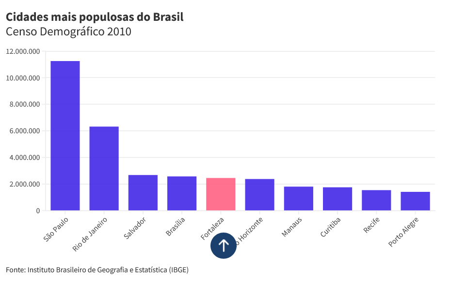 Fortaleza passou a ser a quarta cidade mais populosa do Brasil, de acordo com o Censo Demográfico 2022, realizado pelo Instituto Brasileiro de Geografia e Estatística (IBGE). Em 2010, data da última pesquisa censitária nacional, a Capital tinha 2.452.185 habitantes e ocupava a quinta posição do ranking.