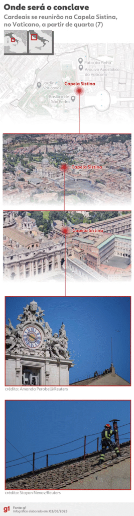 O conclave, reunião dos cardeais da Igreja Católica para eleger o novo pontífice, está marcado para começar na quarta-feira, 7 de maio. Desde a segunda passada, a Capela Sistina está fechada para visitação para dar início às preparações necessárias.
