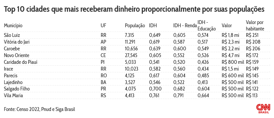 A CNN cruzou os dados de todos os repasses do governo aos municípios via transferências especiais até o dia 16 de junho (quando as informações foram extraídas do portal Siga Brasil) com as informações mais atualizadas de habitantes, PIB per capita, salário médio mensal e IDH.