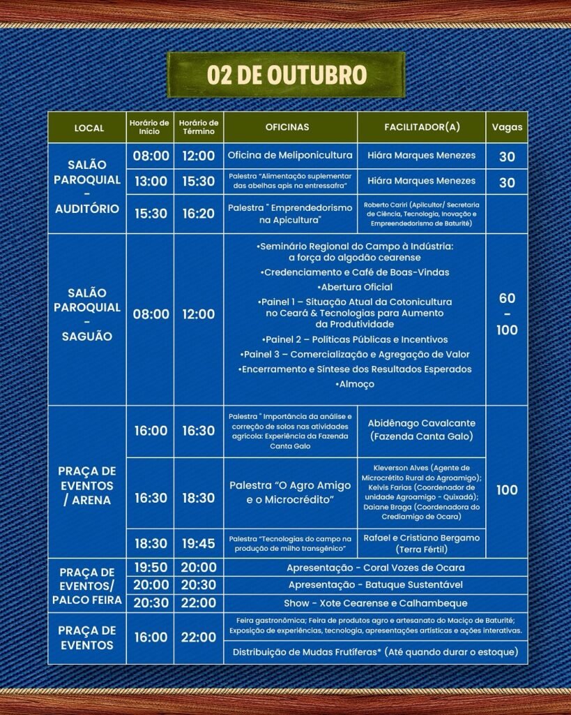 O Seminário Regional foca na força do algodão cearense (08h às 12h), com painéis sobre a cotonicultura, políticas públicas e incentivos. No final da tarde (18h30), a Praça de Eventos/Arena promove a palestra “O Agro Amigo e o Microcrédito”. A noite encerra com a Apresentação – Batucada Sustentável e o show de Xote Cearense e Calhambeque.