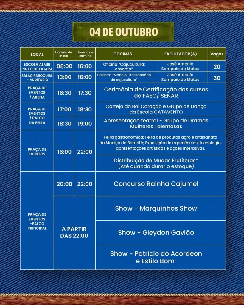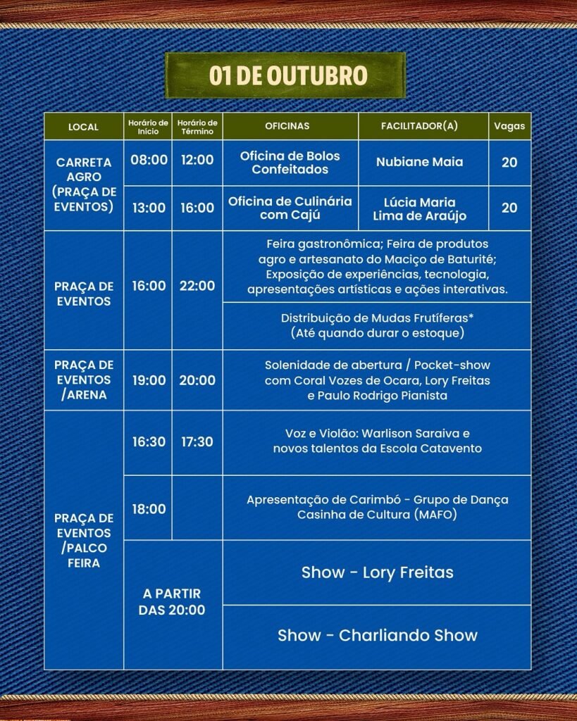 A partir das 16h, inicia-se a Feira gastronômica, de produtos agro e artesanato, acompanhada da Distribuição de Mudas Frutíferas. O ponto alto é a Solenidade de abertura (19h), seguida de um pocket-show com o Coral Vozes de Ocara, Lory Freitas e Paulo Rodrigo Pianista. A primeira noite de shows na Praça de Eventos/Palco Feira tem Lory Freitas e Charliando Show.