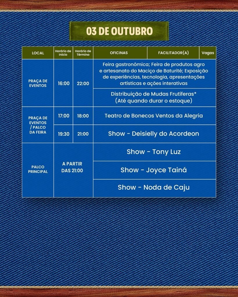 O dia de abertura foca na culinária local, com a Oficina de Bolos Confeitados (08h às 12h) e a Oficina de Culinária com Caju (13h às 16h) na Carreta Agro, na Praça de Eventos.