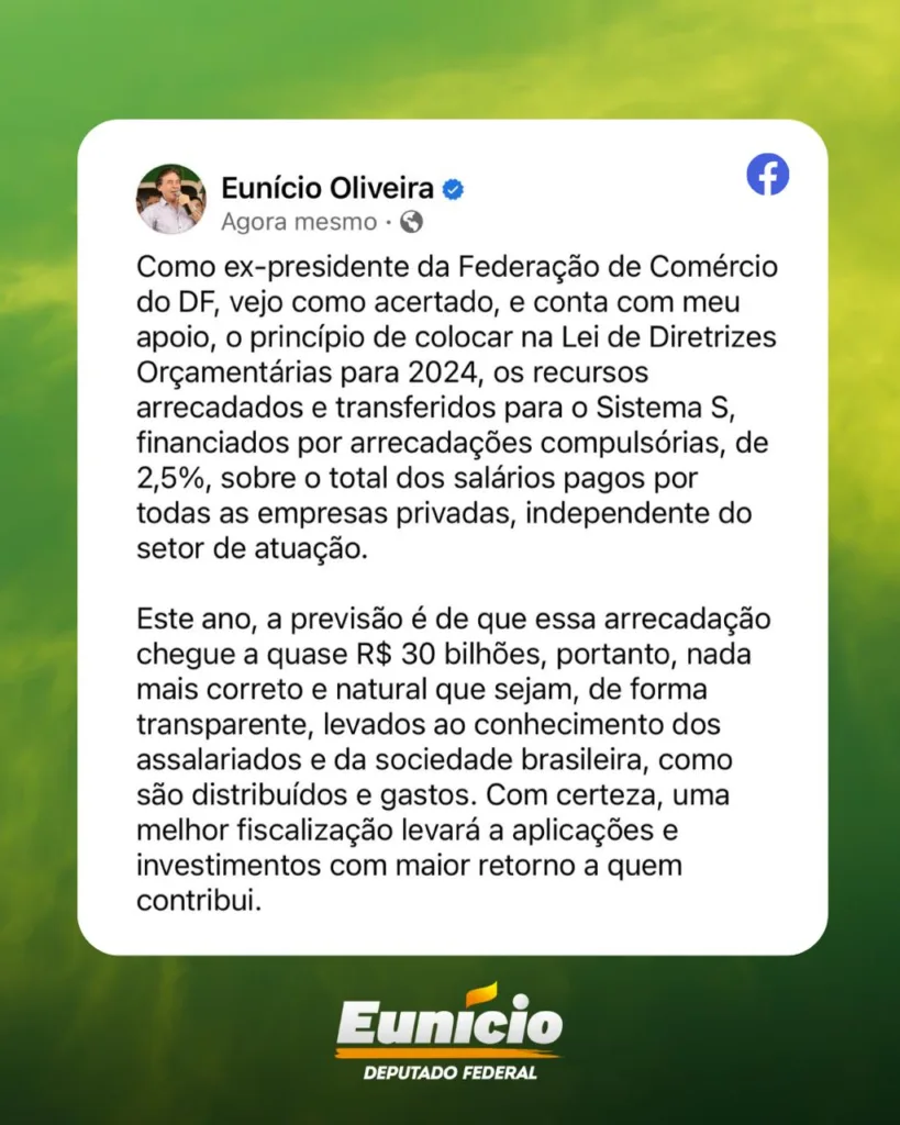 “Como ex-presidente da Federação de Comércio do DF, vejo como acertado, e conta com meu apoio, o princípio defendido pelo relator Danilo Forte, de colocar na Lei de Diretrizes Orçamentárias para 2024, os recursos arrecadados e transferidos para o Sistema S, financiado por arrecadações compulsórias que podem chegar até 2,5% sobre os salários pagos pelas empresas. Este ano, a previsão é de que essa arrecadação chegue a quase R$ 30 bilhões. Portanto, nada mais correto e natural, que sejam, de forma transparente, levados ao conhecimento dos assalariados e da sociedade brasileira, como são distribuídos e gastos. Com certeza, uma melhor fiscalização levará a aplicações e investimentos com maior retorno a quem contribui”, explicou Eunício Oliveira.
