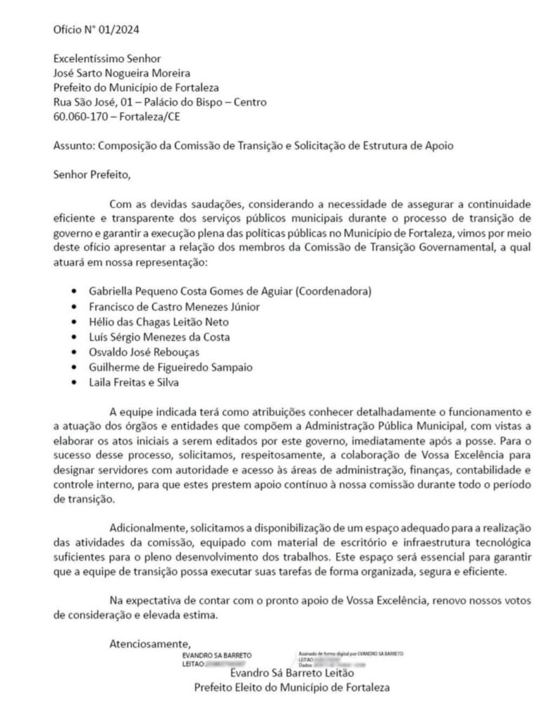 O prefeito eleito de Fortaleza, Evandro Leitão (PT) anunciou na manhã desta quinta-feira, (PT), sua equipe de transição para a nova gestão.