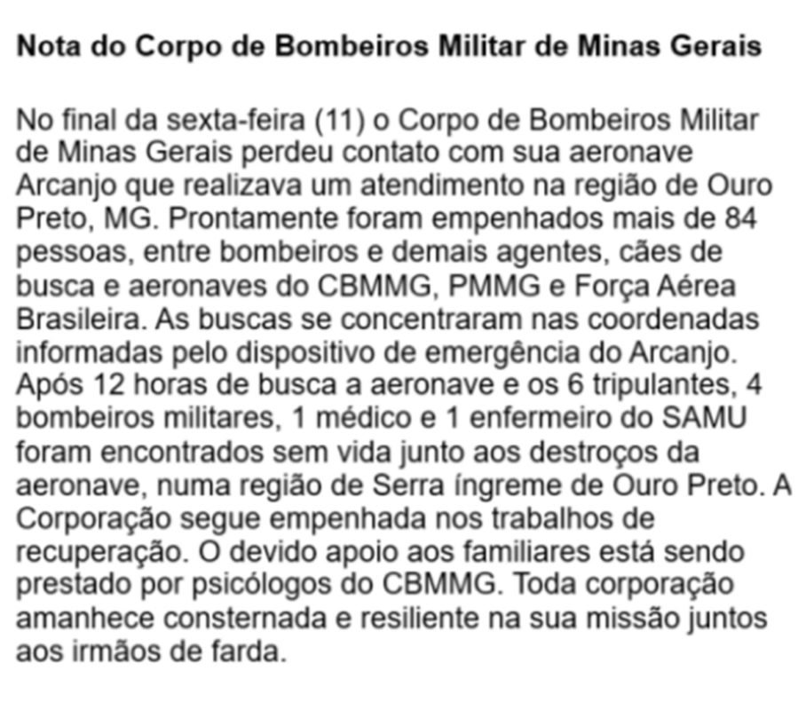 O Corpo de Bombeiros soltou nota de pesar pelo ocorrido. Veja: