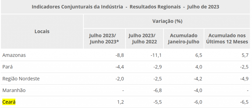 A produção industrial no estado do Ceará avançou 1,2% em julho frente a junho, na série com ajuste sazonal. A única alta na produção industrial entre os locais pesquisados, eliminando, dessa forma, parte da queda de 6,0% verificada em junho. Segundo dados divulgados pelo Instituto Brasileiro de Geografia e Estatística (IBGE), frente a julho de 2022, houve redução de 5,5% em julho de 2023.