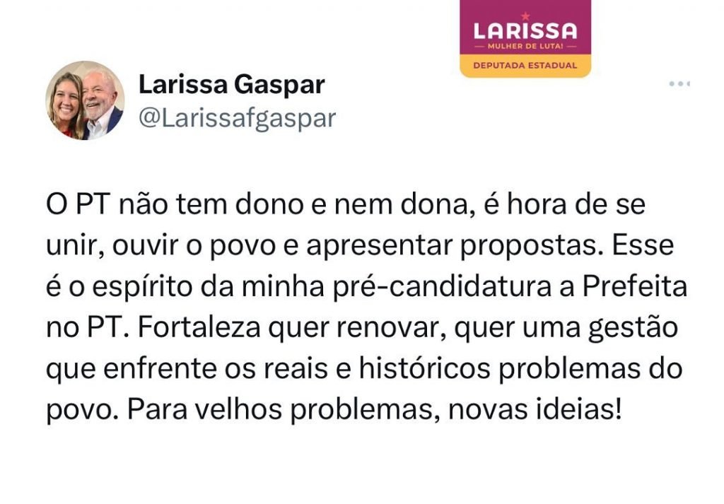 Em publicação nas redes sociais, a parlamentar afirmou que o PT não possui donos. “O PT não tem dono e nem dona, é hora de se unir, ouvir o povo e apresentar propostas. Esse é o espírito da minha pré-candidatura a Prefeita no PT. Fortaleza quer renovar, quer uma gestão que enfrente os reais e históricos problemas do povo. Para velhos problemas, novas ideias!”, escreveu Larissa Gaspar.