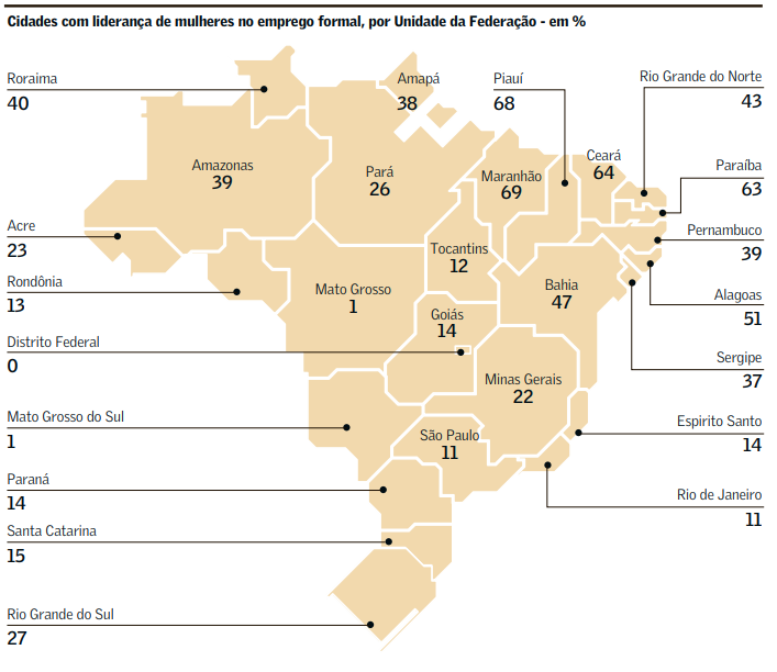 Levantamento divulgado nesta segunda-feira no jornal Valor Econômico, com dados da Relação Anual de Informações Sociais (Rais), aponta que as mulheres lideram o trabalho formal em 30% dos municípios brasileiros.