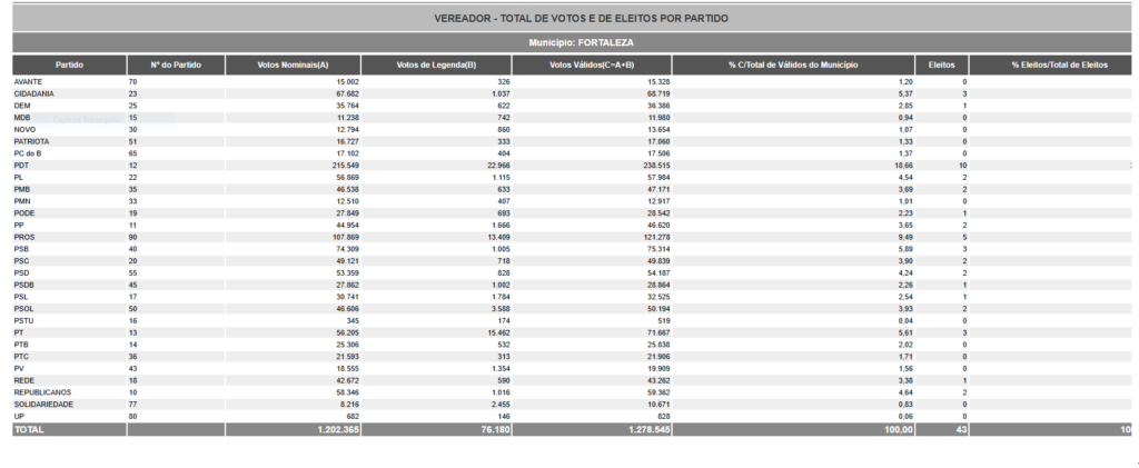Em 2020, o Tribunal Regional Eleitoral registrava 1.821.382 eleitores aptos a votar, em outubro daquele ano, para prefeito e vereadores de Fortaleza. Quase 400 mil eleitores não foram votar, registrando uma abstenção muito grande. Ao final do processo de votação somaram-se apenas 1.423.608 votos válidos, junto com os de legenda, válidos e nulos. O quociente eleitoral, que é a divisão dos votos válidos pelo número de vereadores (43 em Fortaleza) chegou 29.734 votos. Só um dos atuais vereadores, Ronaldo Martins, ultrapassou o quociente eleitoral. ele somou 31.840 sufrágios.
