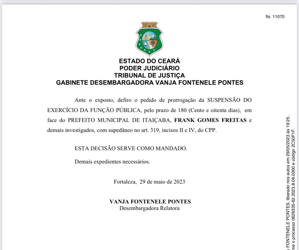 A desembargadora Vanja Fontenele prorrogou na tarde desta segunda-feira (29) a suspensão do prefeito de Itaiçaba, Frank Gomes, por mais 180 dias. O prefeito chegou a comemorar o retorno ao cargo, iniciando carreata na cidade, mas foi surpreendido com a nova decisão.