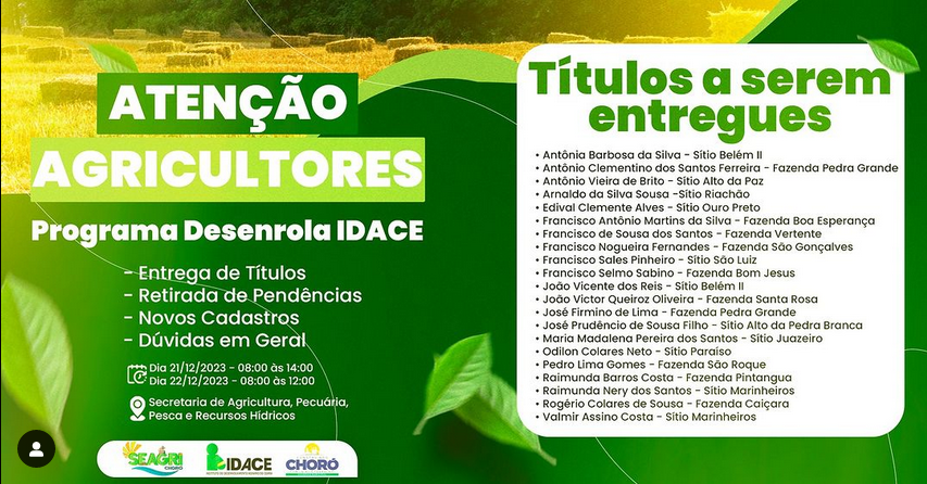 A Secretaria de Agricultura, Pecuária, Pesca e Recursos Hídricos de Choró, encerra nesta sexta-feira (22), os atendimentos do programa ‘Desenrola Idace‘.
