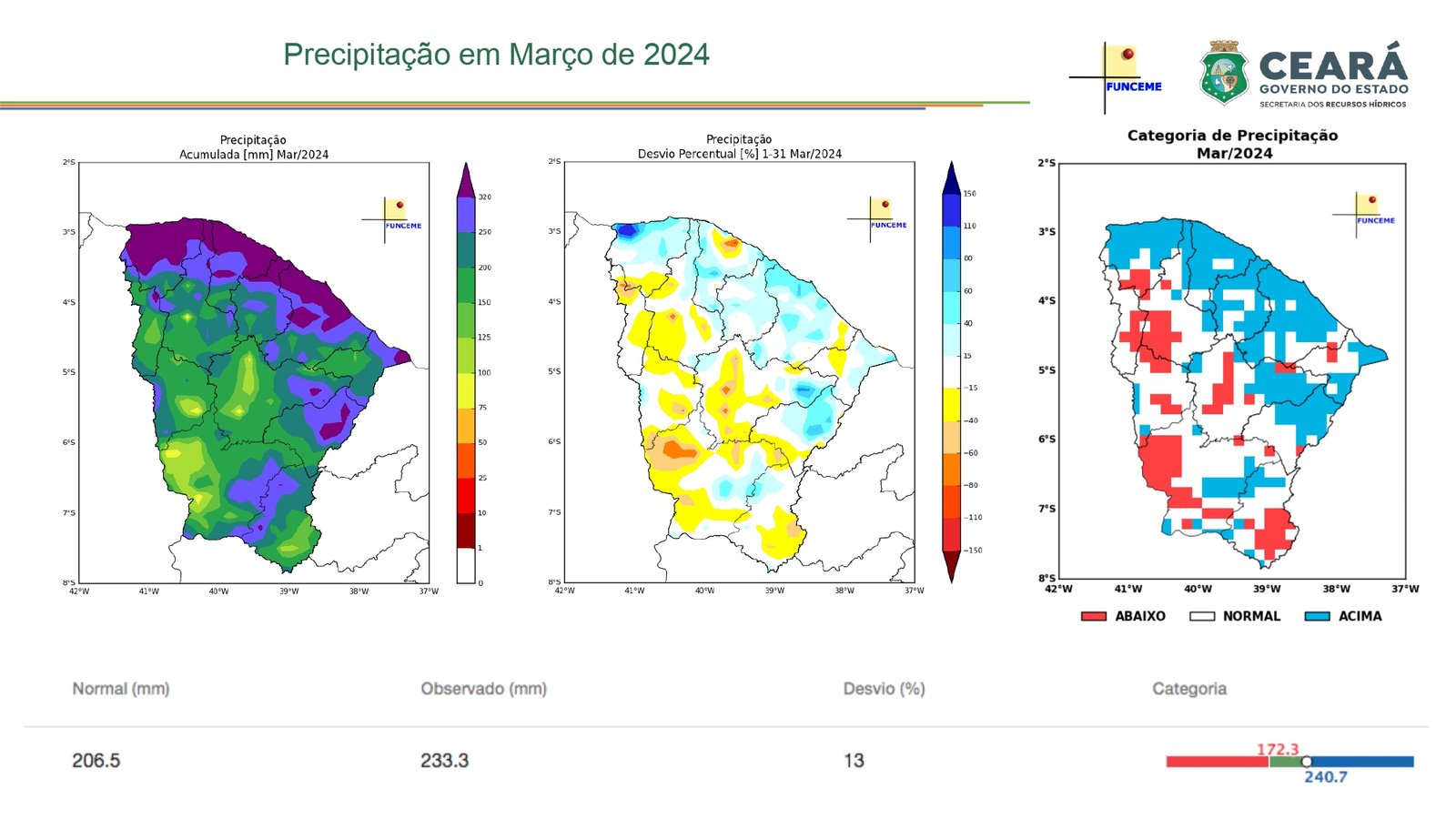 Conforme os dados apresentados, a média histórica de chuvas para o período é de 609,2 milímetros. O observado neste ano foi de 764 mm. Os dados positivos têm relação direta com as precipitações entre fevereiro e março, principalmente. Nestes meses, os acumulados foram mais expressivos, puxando o acumulado final para cima. Conforme Funceme, o primeiro apresentou um desvio de quase 100%, já o segundo, de 13%.