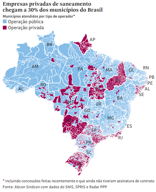 Desde a aprovação do marco legal do saneamento básico, em 2020, o setor privado tem registrado uma expansão significativa no Brasil. O número de municípios com serviços de água e esgoto geridos por empresas privadas saltou de 291, em 2019, para 1.648 em 2024 — um aumento de 466%, de acordo com dados da Abcon (Associação e Sindicato Nacional das Concessionárias Privadas de Serviços Públicos de Água e Esgoto).