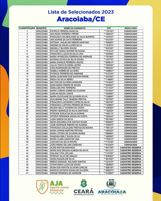 A Secretaria do Meio Ambiente e Mudança do Clima (SEMA), divulgou em cumprimento ao Anexo III – Cronograma do Edital SEMA Nº 02/2023, o resultado o preliminar dos candidatos e selecionados para o Programa Agente Jovem Ambiental de Aracoiaba.