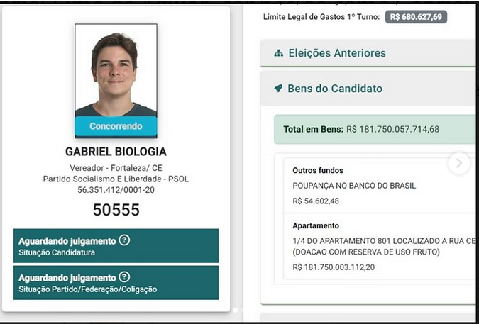 Por um breve momento, o candidato mais rico das Eleições de todo o país era o vereador de Fortaleza, Gabriel Biologia, do PSOL. No sistema do Tribunal Superior Eleitoral (TSE) ele aparecia com patrimônio de R$ 181.750.057.714,68.